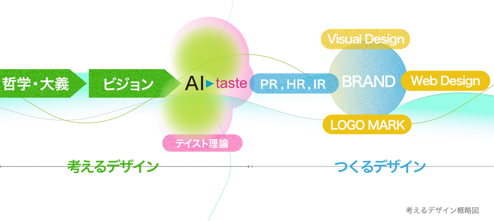 クリエイティブプロセスは「考えるデザイン」と「つくるデザイン」といった2つの段階に分かれます。私たちは、これらの思想と表現をつなぐものとしてテイスト理論を構築しました。